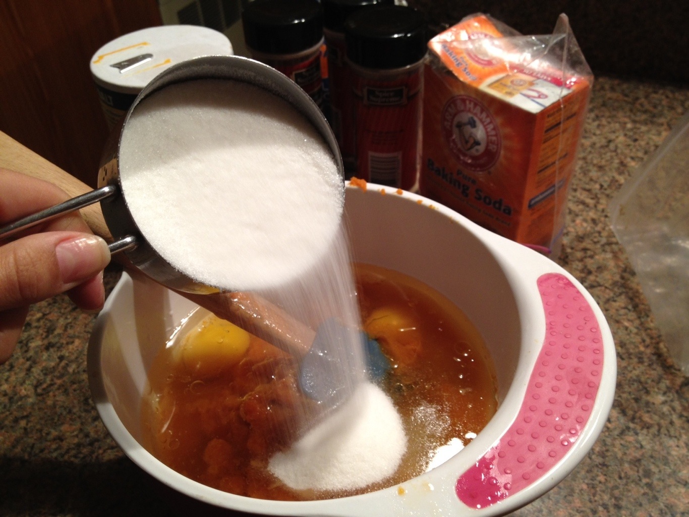 Now for the topping. Get out your food processor. Add the butter, brown sugar, flour, pecans, and dash of salt. Process it until mixed and big clumps form. Set aside.