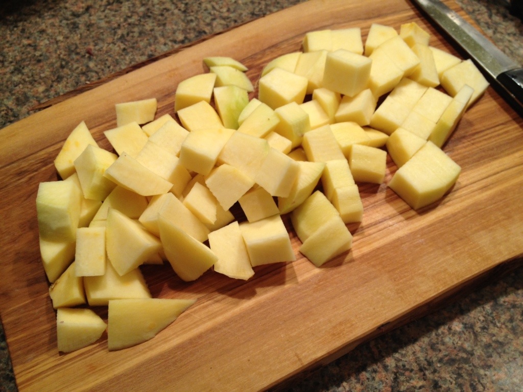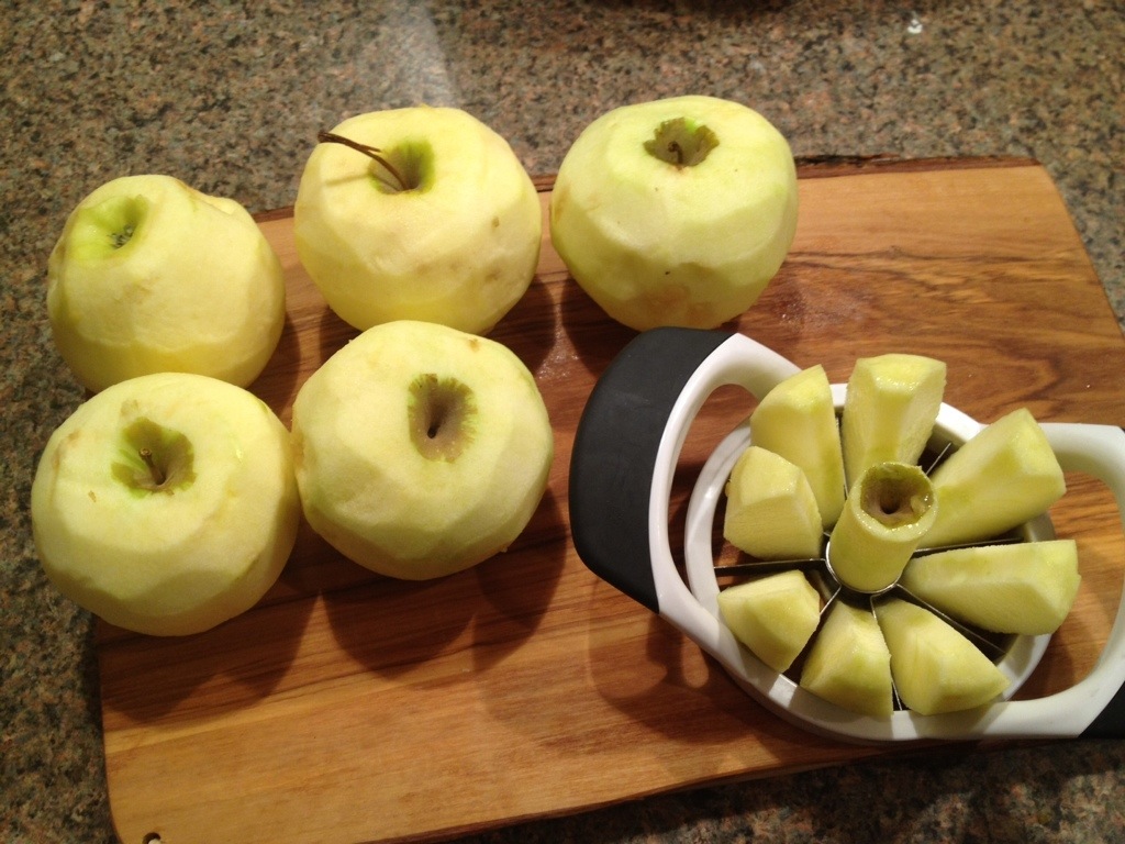 Peel your apples and core them. I used my apple slicer that my kick-ass grandmother gave me. After I sliced them, I cut each slice in half, and a few in thirds so I’d have a few thinner ones as well.