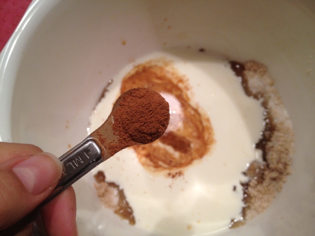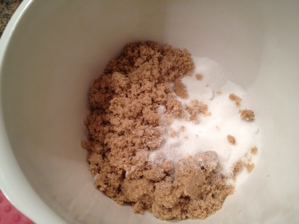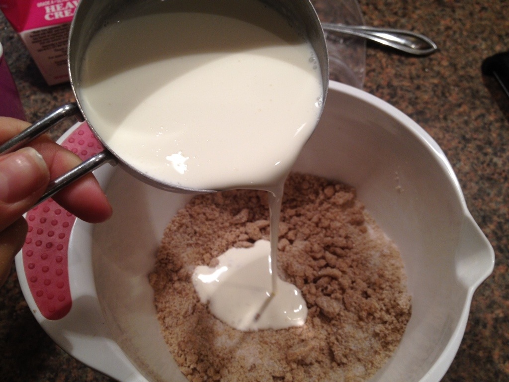 Next, for the filling. Add both your brown and white sugar to a bowl, and mix. Add your heavy cream, vanilla, cinnamon and flour.