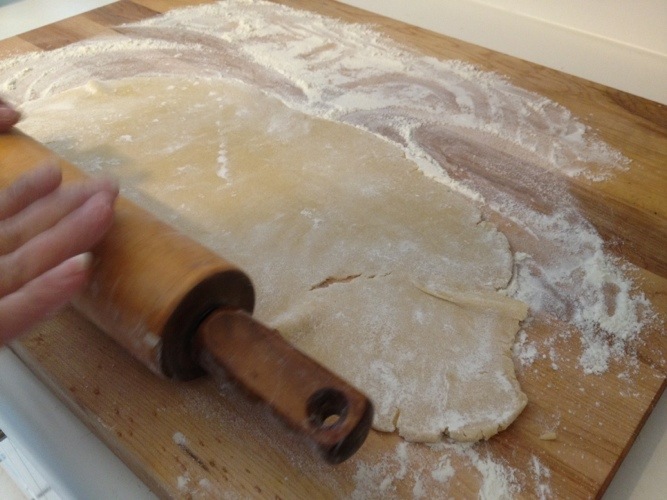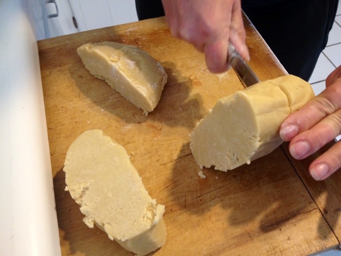 She makes the dough the day before and lets it sit in the fridge overnight to harden. I wasn’t there when she made the dough, so I don’t have photos for that part, but it’s pretty simple: mix the flour, baking powder, and salt in a bowl. Set aside. In a separate bowl with an electric mixer, beat the butter, sugar, eggs, and vanilla, until light and fluffy. Mix in the flour a little bit at a time until fully incorporated. Remove from the bowl and shape into a ball. Wrap in Saran wrap/waxed paper and place in the fridge overnight.