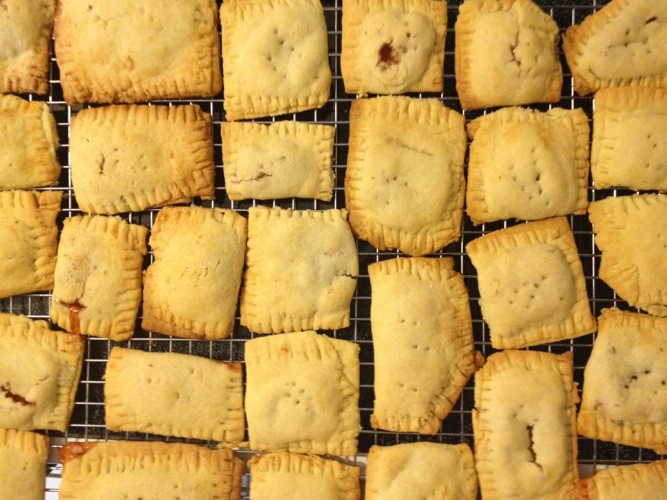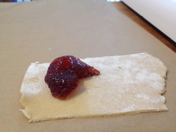 Plop a scoop of jam in the center and fold in half. Use a fork to seal the edges. Flouring the fork here and there helps it from sticking. Poke a few little holes in each turnover (to keep them from exploding when in the oven) and place them on a baking sheet lined with parchment paper. Work fast otherwise the dough will warm up and begin to stick to things. Repeat with the rest of the dough.