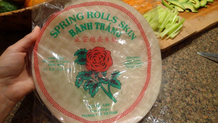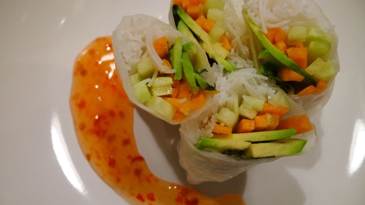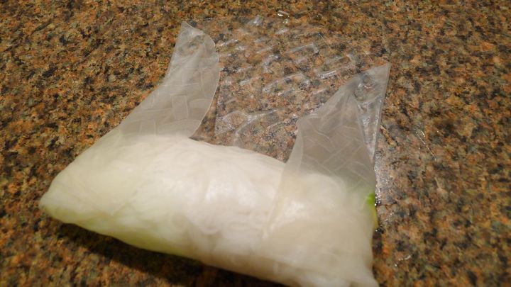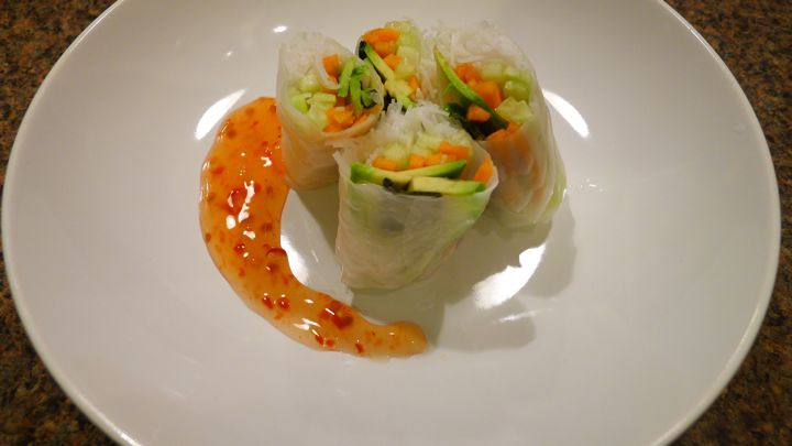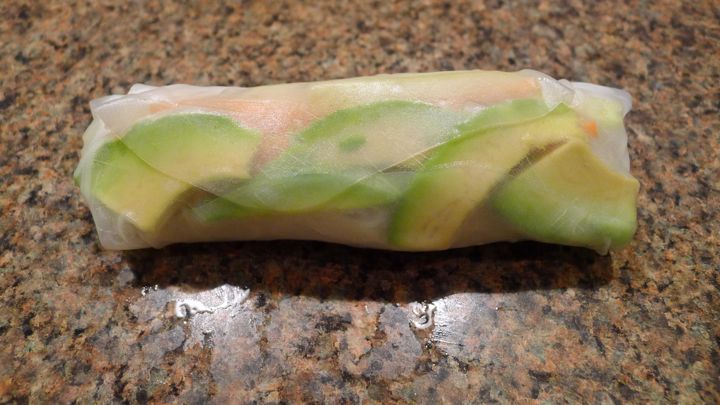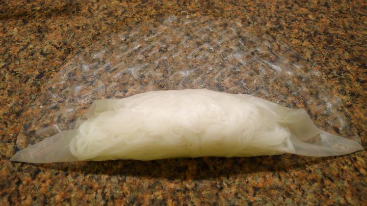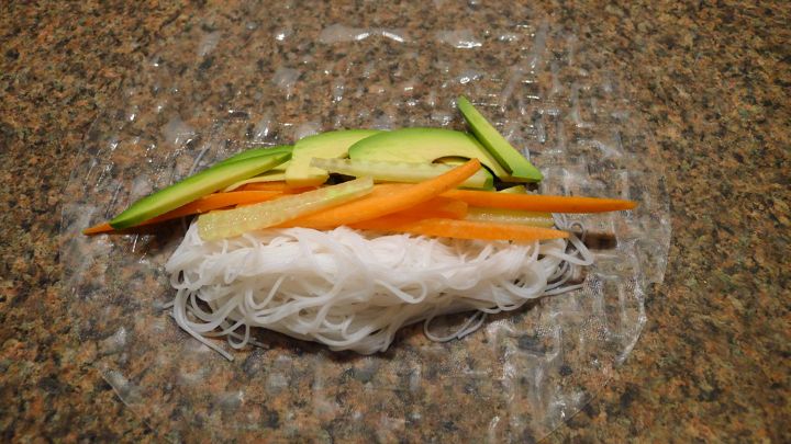 Next, fill a shallow dish with lukewarm water (I always use a pie dish) and add one of your spring roll skins making sure to get it completely submerged underwater for about 15-20 seconds. You want it to feel like it is about to get “noodley” but still has some firmness to it. Reason being, once you remove it from the water, you’ll see that it still continues to loosen up a bit. Place the sheet on a flat clean surface. Add your noodles along with you other ingredients. Place them a little under the center line though so when you roll you’re able to get it tight. Try to work fast before the wrapping starts to get stuck to the surface (if it does just keep dipping your fingers in water as you’re rolling it, this helps a lot). Start by folding up the bottom and tucking it under the ingredients, next fold in the sides, then roll it up! It’s just like rolling a burrito really. Cut in a diagonal in half and serve with dipping sauce!