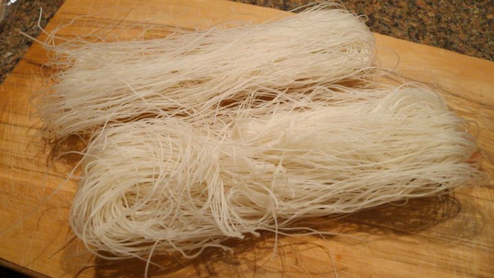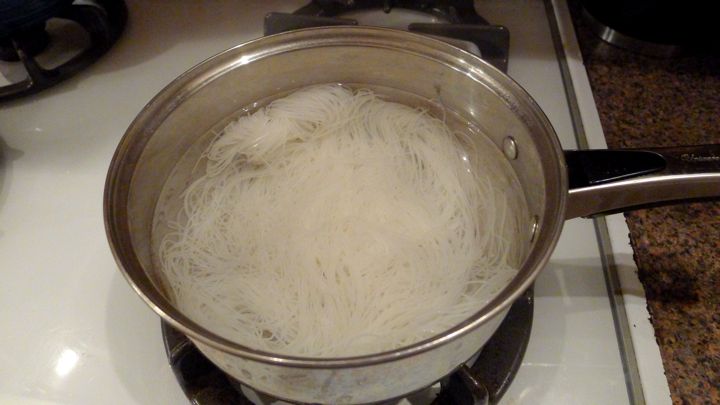 Start by chopping all of your vegetables into thin pieces. Next, get a pot of water boiling then remove it from the heat. Add your rice noodles and let sit in the water for about 8-10 minutes. Drain and run under cold water until the noodles are cold. Set aside. I only usually cook 1/4 of the package at a time because it makes a lot of noodles!