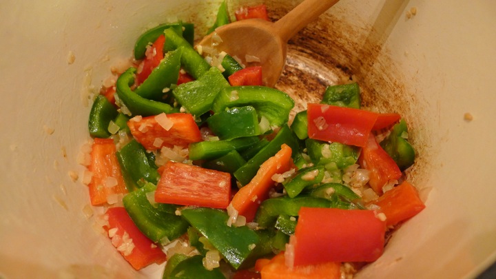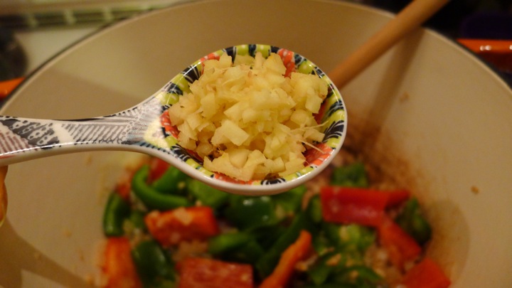 Start off by chopping everything up and having it all ready to go. Heat the oil over medium heat and add your onions and 1 teaspoon salt. Cook until translucent, about 5 minutes. Add the garlic, peppers, and ginger and cook another minute or so. 11