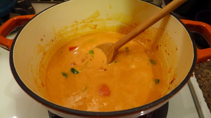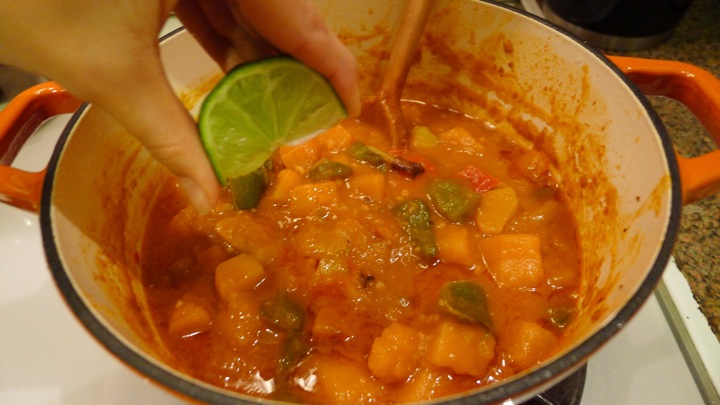 Continue adding the red curry paste, covering the onions and peppers. Next throw in your coconut milk, water, soy sauce, and remaining 1/2 teaspoon of salt (which I forgot). Simmer for 25 minutes or until squash is fork tender. Remove from heat, add the lime juice, and serve over warm rice with chopped cilantro.