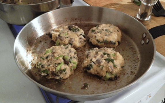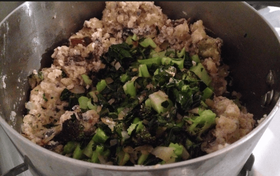 Start by placing the potatoes in a pot of boiling salted water. Cook until fork tender, but make sure not to overcook! While those are going, saute the garlic in some olive oil for about a minute, then add the onion and cook for another 2 minutes or so. Next add the chopped kale and broccoli. Cook everything down until softened. When the potatoes are done, drain them and add back into the pot with the butter, egg, Greek yogurt, and some salt and pepper. Smash everything together, then mix in the cooked vegetables. To cook the potato cakes, form the cakes in your hand and place in the pan with some olive oil over medium heat. Flip them around 3 minutes. You want each side to have a little golden crisp to them.