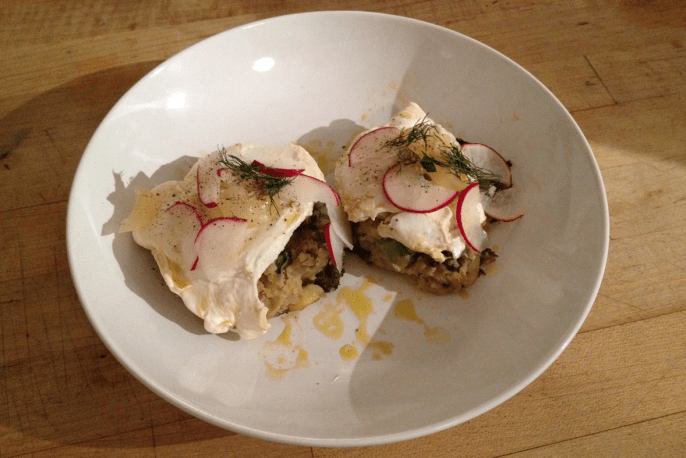 To plate, place two potato cakes on a plate and top with the poaches eggs, followed by a good drizzle of the onion sauce. Top with some fresh dill and sliced radishes!