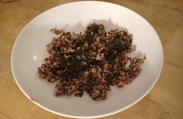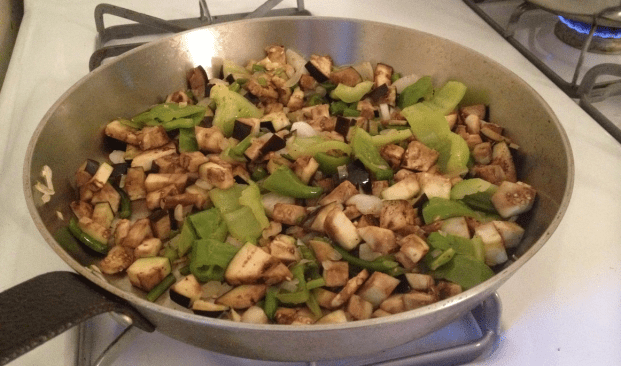 Start by making the quinoa. While it is cooking, add in the chopped kale and lemon zest. Next make the vinegar mixture for the green beans and tomato- mix the red wine vinegar, olive oil, lemon juice, and a small pinch of salt and pepper. Blanch the green beans for a minute or two, then add them to the vinegar with the fresh tomatoes and let soak until ready to plate. In a separate pan, add some olive oil and cook the onion and garlic until softened, then add the eggplant, green pepper, garlic scapes, nuts, and a little salt and pepper.