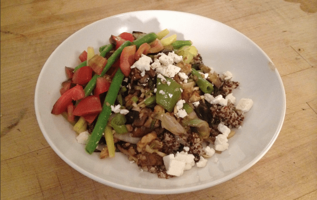 Plate some of the quinoa, then top with the eggplant mixture, green beans, and tomatoes. Finish with some feta cheese and a little drizzle of the vinegar.