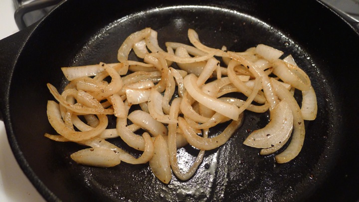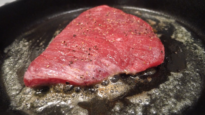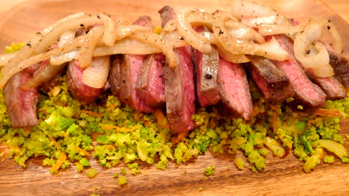 For the steak, add a tablespoon of butter to a cast iron pan. When it’s nice and hot throw on the steak and cook for 3-5 minutes on each side, depending on the thickness of the cut. Remove from the pan, cover with aluminum foil, and let rest for at least 5 minutes. The steak continues to cook after it comes off the pan, so resting it lets it do its thing and get nice and juicy. While the steak is getting awesome, add a little more butter to the pan and cook the onions until translucent, and making sure to scrape up any goodness leftover from the steak. Cut the steak against the grain and plate with the couscous and onion!