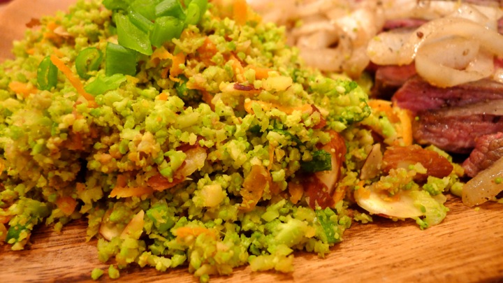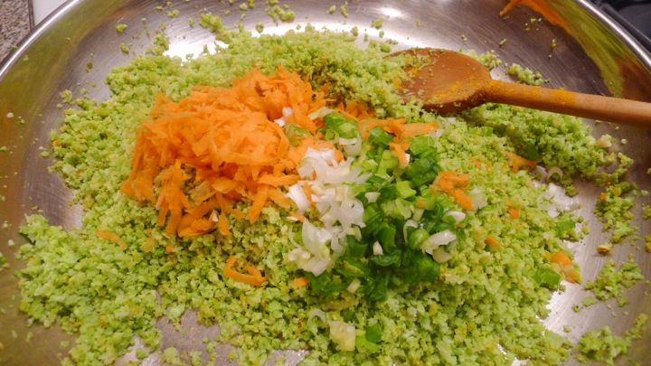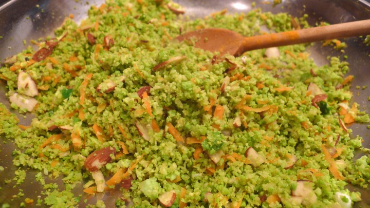 Chop up the romanesco and add it to a food processor, blending until it resembles the texture of couscous. Best to do it in smaller amounts so it breaks up evenly. Add a little olive oil to a pan and saute the garlic for a minute or so, then add 1/4 cup water and the romanesco. Cook, stirring enough that it doesn’t burn at all. Add the shredded carrot, green onions, and ginger. Next add the cumin and tumeric, then salt and pepper to taste. Lastly, toss in the almonds. Set aside and cover to keep warm.