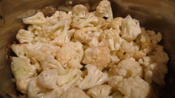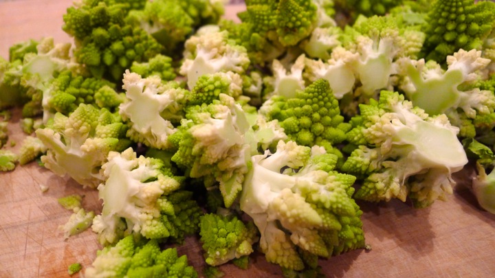 Romanesco cauliflower is one of the coolest looking vegetables. I always take a few days to cook it because I like opening my fridge and seeing a spiky green diamond in there! I read somewhere that “It’s the Lady Gaga of Cauliflower,” which is a pretty accurate description. Despite it’s funky look, it tastes just like regular cauliflower. I had seen a recipe recently that used cauliflower as mock couscous and thought that would be a fun experiment. I loved it! I even mixed some of the leftovers into my scrambled eggs in the morning, which was delicious. I will definitely be making this again!