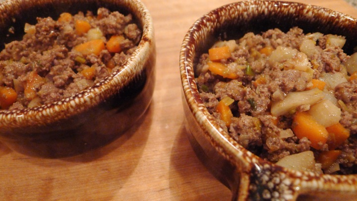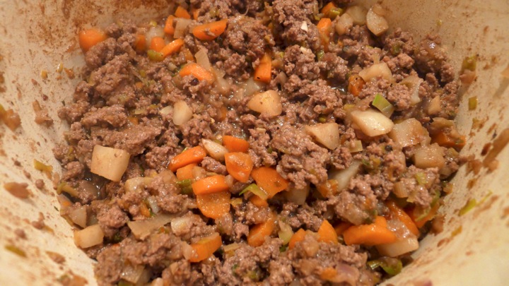 Preheat oven to 350 degrees. In a baking dish or oven safe bowls, put a good layer of the beef mixture on the bottom and top with the mashed potatoes. Cook for 10-15 minutes in the oven then top with a sprinkle of grated Parmesan cheese and put under the broiler for a few minutes.