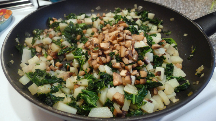 For the enchiladas, boil the potatoes until fork tender, and cook the mushroom in a skillet until slightly browned. In a large skillet, sauté the onion and garlic until translucent, about 3 minutes or so. Add the kale and cook until wilted, then toss in the mushrooms, potato, red pepper flakes, salt and pepper, and let cook for a few more minutes.