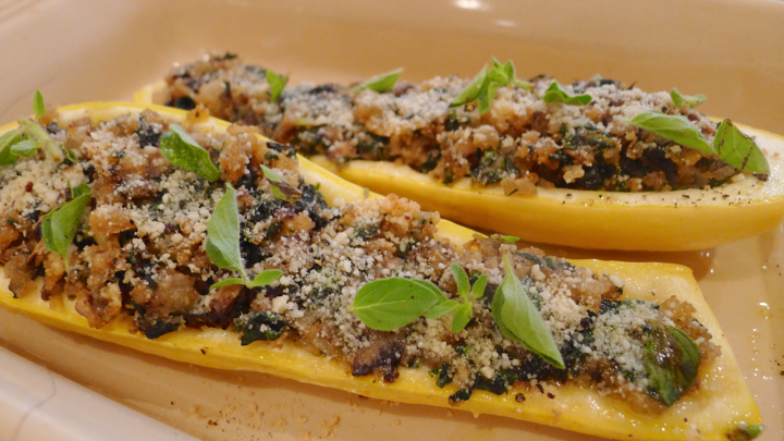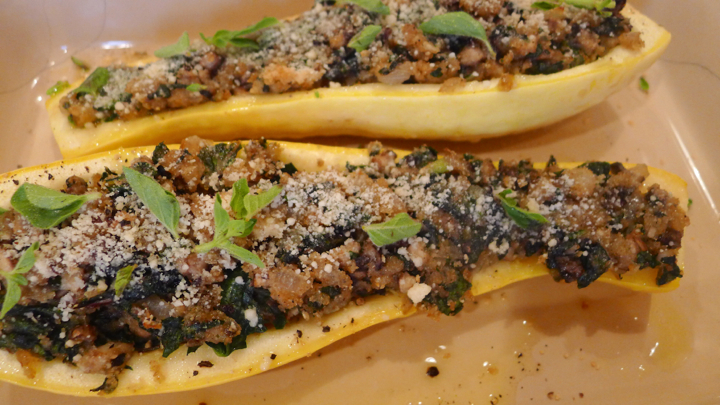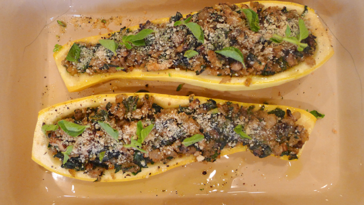 Heat oven to 350 degrees. In a large pan, sauté the garlic and onion until translucent, about 2 minutes. Add the Swiss chard and mushrooms, and cook until the greens are wilted. Next add the red pepper flakes, Parmesan cheese, and bread crumbs. Salt and pepper to taste. Fill the squash “boats” with the vegetable mixture and top with extra Parmesan cheese. Place in oven for about 30 minutes or until the squash is cooked through. Plate and serve with a simple side salad. Enjoy!