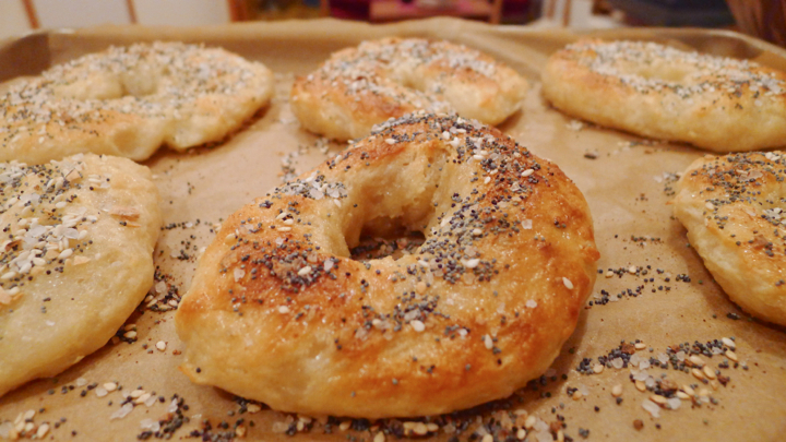 FINALLY, put all the bagels into the oven and cook for 10 minutes. Remove and brush with the egg wash, then top with whatever your little heart desires. Place back in the oven for another 10 minutes or until the tops are golden brown. Let sit for 15 minutes before serving, as they will continue to cook and fluff up on the inside during this time.