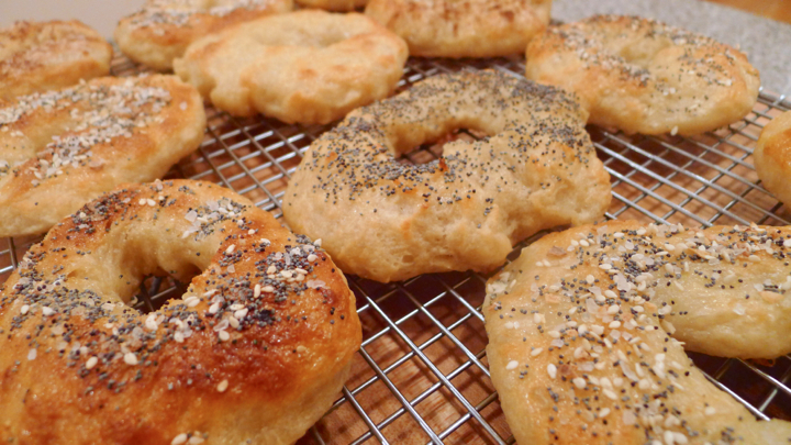 When the dough is ready, drop 1-2 bagels into the boiling water at a time. Let cook for 30 seconds on each side, then transfer to a rack to dry before placing back on the parchment lined baking sheet.