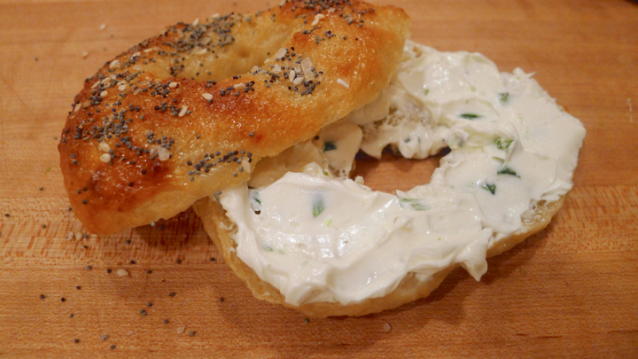 I chose to eat mine covered in garlic scape cream cheese, which I made by roasting the garlic scapes in the oven, then mixing them with the cream cheese in my food processor. For the cinnamon sugar bagel, I think my plan will be to muddle some fresh strawberries into the cream cheese! I LOVE CREAM CHEESE ANYTHING.