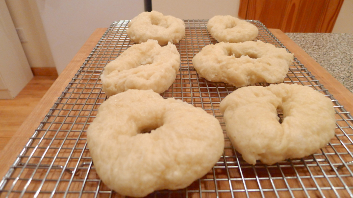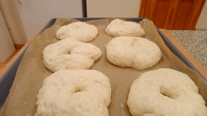 When the dough has fully risen, punch it down in the bowl (it will deflate) then roll it out into a log shape on a lightly floured surface. Cut 12 equal pieces and roll them into balls then place them on a parchment paper lined baking sheet. Cover with a damp dish towel again and let sit for 20 minutes. Next, create a hole in the center of each bagel with your thumb and index finger, then stretch and turn the ring until you have a 2 inch center. Return them to baking sheet again and let rise for another 20 minutes under the damp cloth. In the meantime, get a large pot of boiling water going and preheat your oven to 425 degrees.