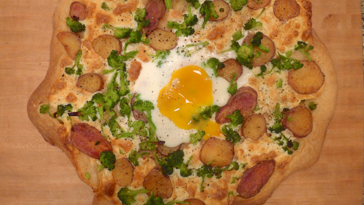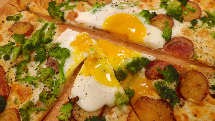 Bring a pot of water to a boil. Cook the broccoli for 1 minute, then transfer to a bowl of cold water to stop the cooking process. Next, saute the garlic in some olive oil for about a minute, making sure not to burn it! Brush the dough with the garlic olive oil, then add layers of mozzarella cheese, potato, and broccoli. Cook the pizza for 15 minutes, then remove it from the oven and crack and egg in the center. Place back in the oven for 10-12 minutes or until the white is set but the yolk is still runny. Remove from oven and with a fork break the yolk so it runs a bit onto the pizza (the best part!) and serve right away. Enjoy!