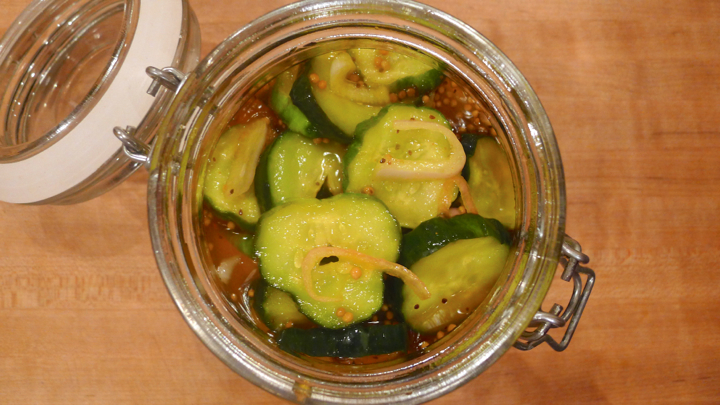 I am a huge fan of anything you can pick out of a jar and eat. My fridge is filled with pickles, olives, marinated mushrooms, stuffed hot peppers… the list goes on. So when I got cucumbers this week in my CSA bag, I figured I may as well just go nuts and add some some bread & butter (sweet) pickles in there too! They’re very easy to make, and if you’re planning to keep them in the fridge to eat over the next few weeks, you get to skip the step of sterilizing the jars. On the other hand, if you’re planning to jar and store these to eat later down the road, you’ll definitely want to bake or boil the jars prior to adding your pickles. Here is a nice little lesson on how to do that from Food52.