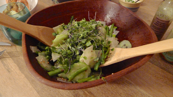 For the salad, place the radishes, cucumber, and asparagus in a large bowl. Mix together the mustard, vinegar, lemon, salt and pepper. Pour over the vegetables and toss well. Top with the microgreens.