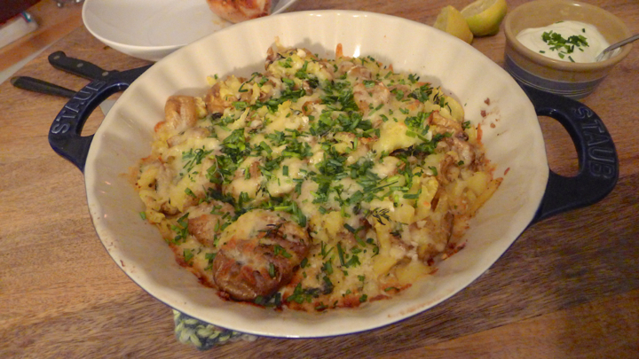 To finish the potatoes, smash each potato by pressing down on each one with the back of a fork or spoon so that they burst. Melt the butter and add the garlic, then pour it over the potatoes. Top with thyme, both cheeses, and the chives. Put back in oven for 10-15 minutes until everything is melted and magical. Place the Greek yogurt in a side bowl, and add a little fresh black pepper and chives.