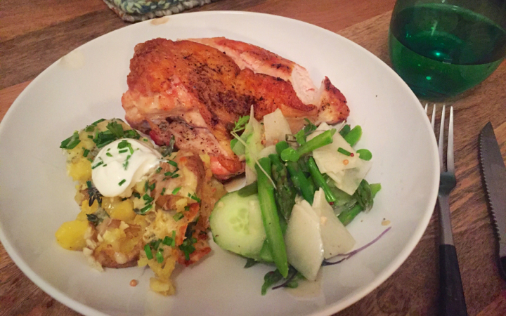 Preheat oven to 400 degrees. Wash the potatoes well and toss in olive oil, salt, and pepper. Roast in oven for 30 minutes or until fork tender. While the potatoes cook, start the chicken.