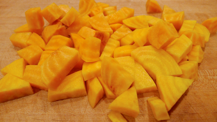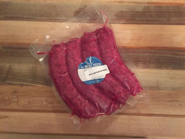 2 beet sausages, casings removed (if you can’t make it to The Meat Hook, sweet Italian sausage would be a nice alt)