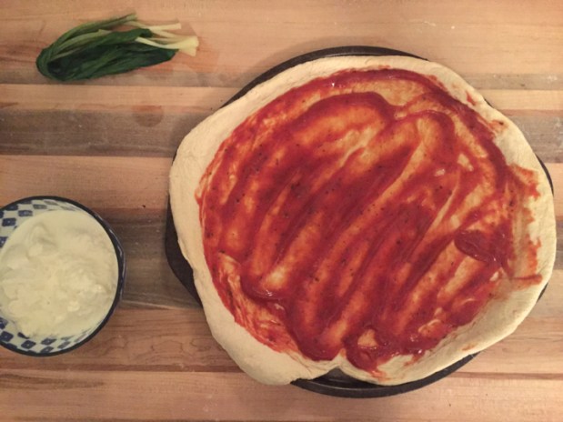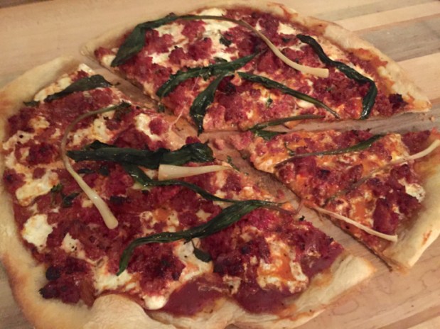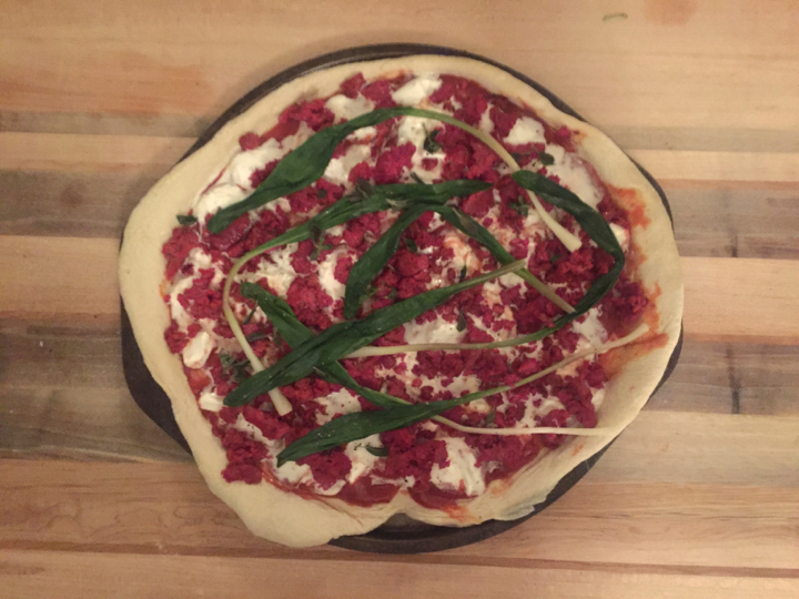 Best pizza ever. I got these amazing beet and onion sausages from The Meat Hook, and the creamy burrata cheese and fresh ramps from The Brooklyn Kitchen. Two places you should definitely stop by if you haven’t already! It was definitely one of my favorite pizza recipes I have made so far. The sausage is so delicious, it has a subtle beet flavor, but nothing too wild. By the way, this was the first time I ever put burrata on a pizza, and it will not be the last. I was concerned that it would make the pizza watery, but it didn’t, it was perfection. And ramps… because it’s ramp season for only so long! Ramps are also called “spring onions” or “wild leeks” – they are in season for a very short time in early Spring, and people go nuts for them. They are from the leek family, but are stronger tasting than leeks and have a garlicky taste to them as well. Get em’ while you can!