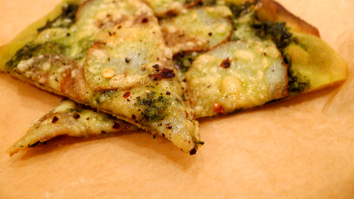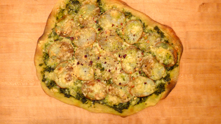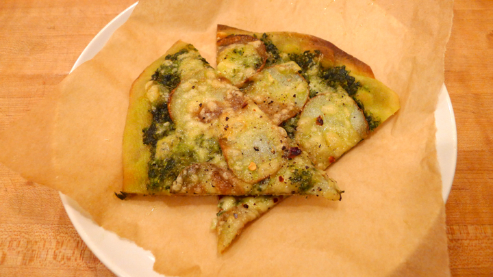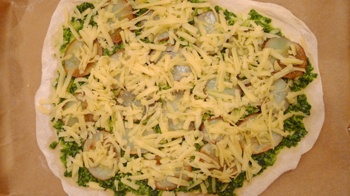 Roll out the dough on a floured surface and place on a baking sheet lined with parchment paper. Spread on the pesto, followed by the potatoes, then top with the gouda cheese. Cook in the oven for about 20-25 minutes, or until the edges are golden brown and the toppings are bubbling. Crack some fresh pepper on top and perhaps come red pepper flakes, and dig in!