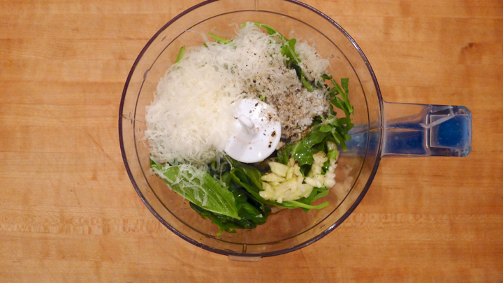 I’ve been eating a lot of pesto lately, it’s just so easy to make and tastes great on so many things. I remembered I had some pizza dough leftover in my freezer, so when I got a ton of basil, arugula, and potatoes in my CSA this week, I knew what I was going to make… pizza. My favorite easy go-to when I want something delicious that doesn’t take too long to make. I didn’t have any nuts on hand so I made a pesto without nuts and actually liked it a lot, didn’t even notice they were missing!