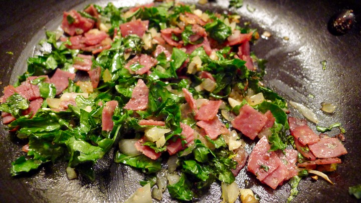 Preheat oven to 350 degrees. In an oven proof skillet, sauté the garlic, onions, and salami in a little olive oil until the veggies are softened and the salami starts to crisp, about 3 minutes. Add the kale and cook for another 3 minutes. Salt and pepper to taste. In the meantime, whisk together the eggs and Greek yogurt in a bowl. You can also use milk, but I like the fluffiness that the yogurt gives the eggs. Pour the eggs into the skillet and give it a quick mix to stir together the ingredients. Top with the tomatoes and goat cheese, and let cook for about 3-4 minutes on the stovetop. Transfer to the oven and let cook for 10 minutes, or until the eggs are set and don’t wiggle when you give the pan a shake. The eggs will continue to cook for a few after you remove the pan from the oven, so do not overcook them in the oven or you’ll be eating some tough eggs!