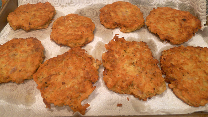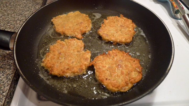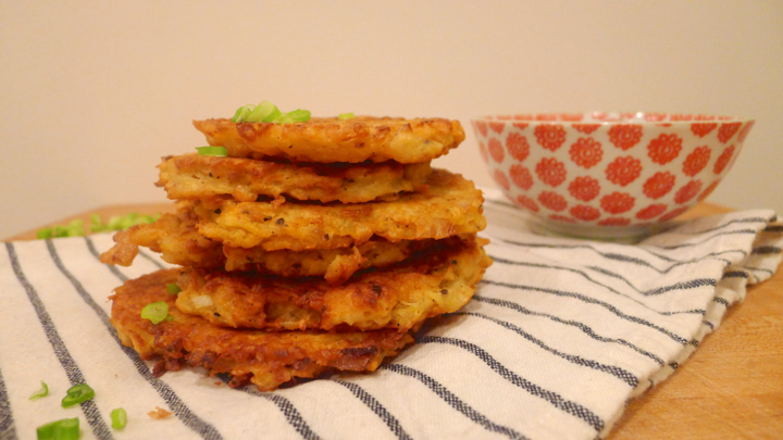 Line a baking sheet with paper towels (to absorb the oil after frying.) In a large skillet, heat the oil over medium heat. To test the oil you can drop a little water into the pan to see if it sizzles. Form the latkes one by one into a 1/2 inch thick patty, and place into the skillet. Flatten a little with your fingers (be careful!) or with the tip of your spatula. I usually fry 4 at a time. Cook for about 3-4 minutes per side, or until golden brown. Transfer to the baking sheet, and continue with frying the rest.