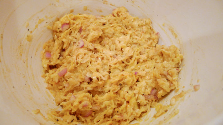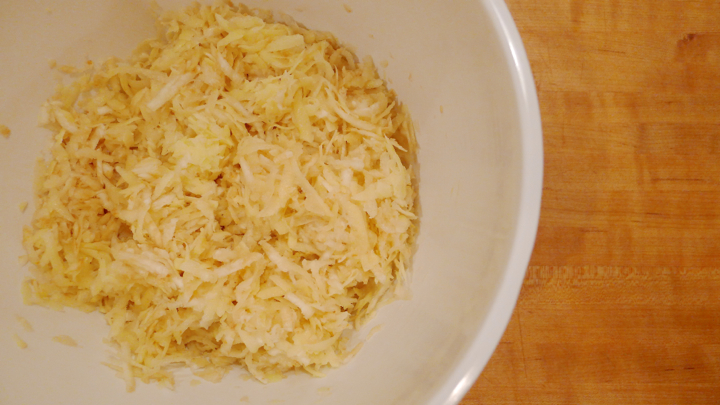 For the latkes, place the grated potato and celery root in a bowl with the salt. Mix well, then place in a colander and let drain for about an hour. Basically the salt will pull out the moisture here, helping the latkes to be crispy and hold together later. Next, squeeze out as much of the moisture as you can, than transfer to a large bowl. Add the shallot, eggs, flour, and spices – pepper, cumin, coriander and turmeric. Cover and place in fridge for about 30 minutes.