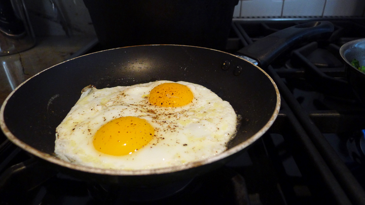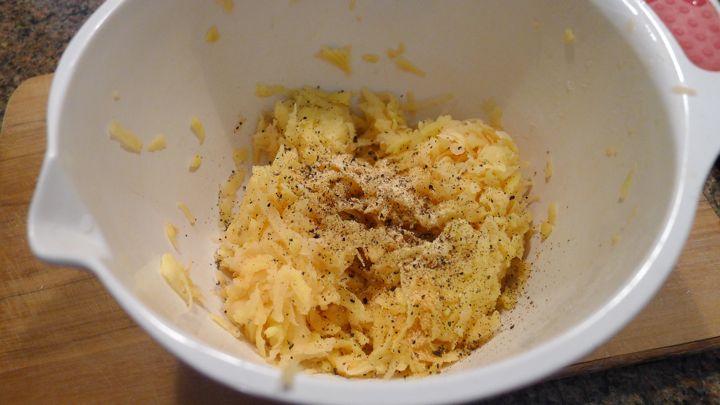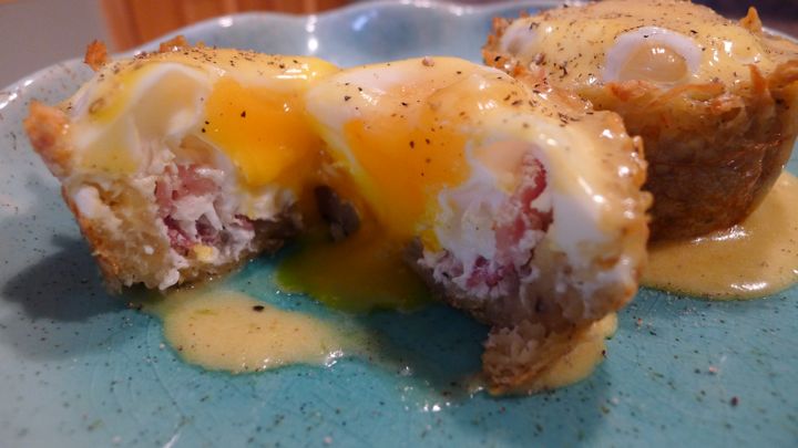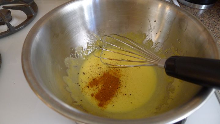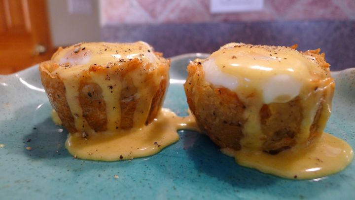 While the hash is a cookin’ start making the hollandaise. Add about two cups of water to a pot and bring to a simmer over low heat. Melt the butter in the microwave and set aside. In a metal mixing bowl, add the egg yolks and lemon juice then whisking vigorously until it thickens and almost doubles in size. Next, place the metal bowl on top of the pot with the simmering water and turn off the heat. Immediately start whisking very fast, slowly pouring in a tablespoon or so of the melted butter. Whisk vigorously the entire time! Add a little more butter and repeat until all the butter is added. Make sure to do just a little butter at a time. Set aside and whisk in a little black pepper, cayenne, and a sprinkle of lemon juice.