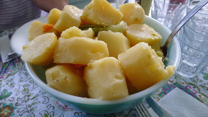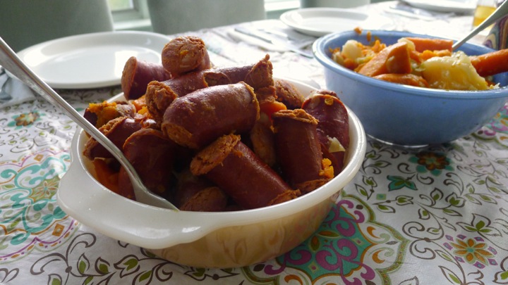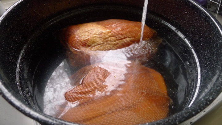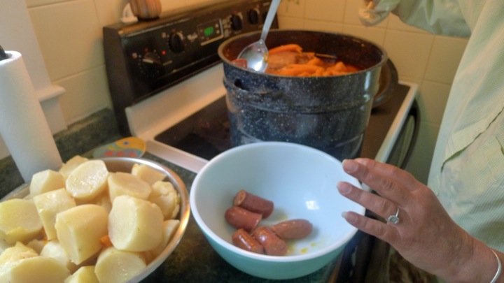 In a HUGE pot, add the pork shoulders and cover with water. Bring to a boil. In the meantime, cut everything else up. What you need to keep in mind is that all of these things will be cooking for a long period of time, so if you cut them to small then they will just cook down to mush. For the carrots, keep all the thin ones whole, and only slice the tops of the ones that are very thick. Next, core the cabbage and cut into quarters. Also peel and quarter the potatoes as well. Finally, cut the linguiça and chourico into about 3 inch pieces.