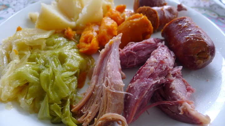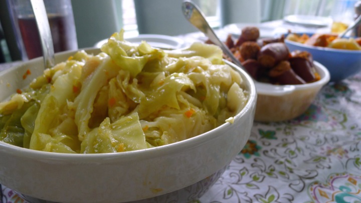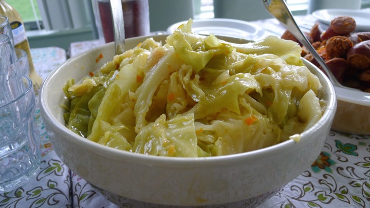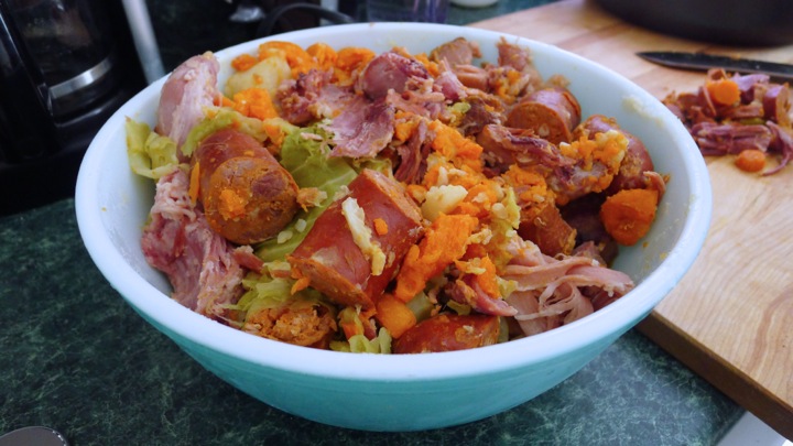 After the pork has boiled for 20 minutes, dump the water and fill it with new water. The reason you do this is to get rid of some the salt that comes off the meat. Add the linguiça and chourico to the pot, pushing it down around the pork. Add the carrots as well then cook for 1 hour. Next add the potatoes and cook for another hour. At this point, depending on how much room you have in the pot, you can either remove the potatoes and sausage or leave them in before you add the cabbage. It really depends on how big of a batch you’re making and how big your pot it. Seeing we were making a huge batch, we removed them then just warmed them through before serving. We also removed one of the pork shoulders (at this point it’s cooked all the way) to make even more room. But if you have the room in the pot or are making the smaller batch, then you can leave it all in! Up to you. Just be VERY careful when scooping things out or moving things around in there, everything has been cooking so long that it can break apart if not handled gently! Once the cabbage is added, cook for one more hour.