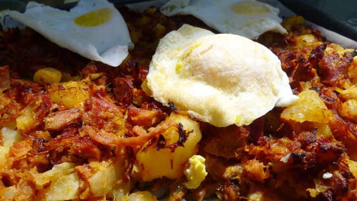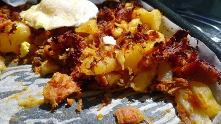 To make the hash, simply chop up the leftovers and add to a frying pan, cooking for about 15 minutes. Next add it to a baking sheet and place in the oven on 350 degrees for another 15-20 minutes or until crispy. Top with some runny poached or fried eggs!