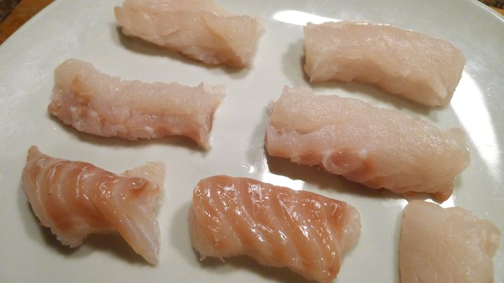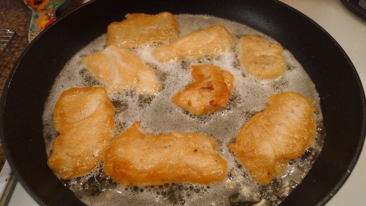 Next make the batter. Mix together the flour, salt, and cayenne pepper in a bowl. Whisk in the beer. It will look like pancake batter. Cut the fish into 4×1 inch slices. Season with salt and pepper. Heat about 1/2 inch worth of the canola oil in a pan over medium heat. To test if it is ready, dip the tip of a wooden spoon in, if it bubbles right away then it is hot enough to fry the fish. Dip each fish piece in the batter and cover well. Shake any excess batter off gently, then add to the pan of oil. Repeat with all fish. Cook for 2-3 minutes on each side until golden brown. If they look like they are cooking too fast, simply turn down the heat. Once ready, remove from the pan and place on paper towel lined rack or plate.