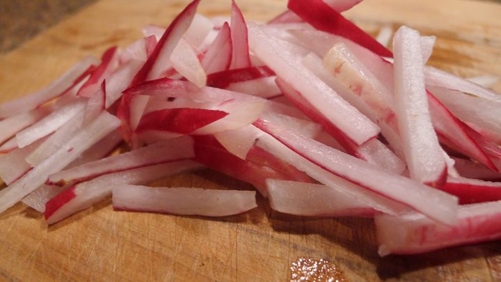 Start by making the slaw. Julienne the kale, then cut the pear and radishes into small matchsticks. Add to a bowl and set aside. Place the other 6 ingredients in a separate small bowl and whisk together. Add it to the slaw and mix well (I did a little at a time until I thought it had enough dressing.) Place in the refrigerator until needed.