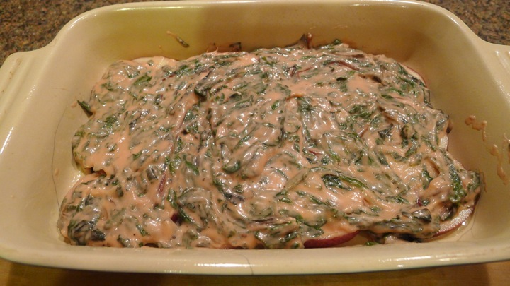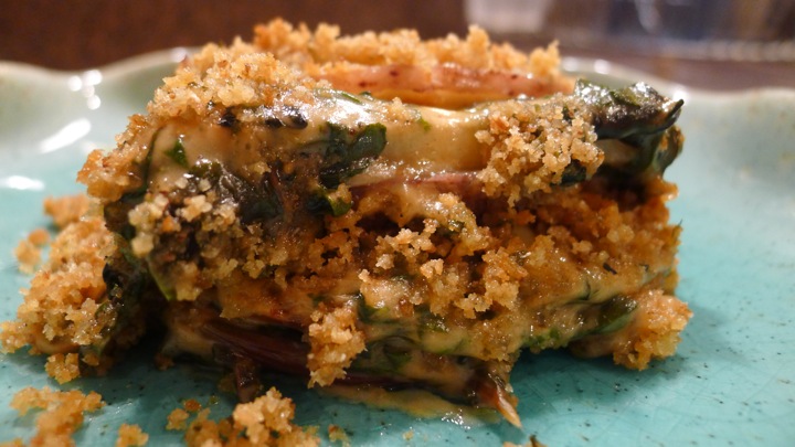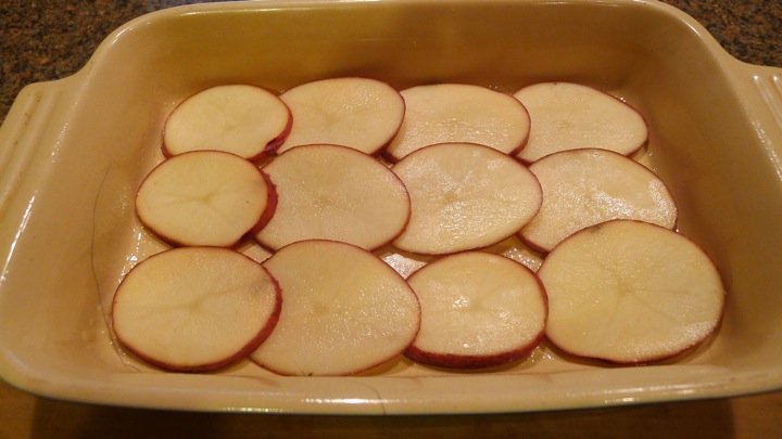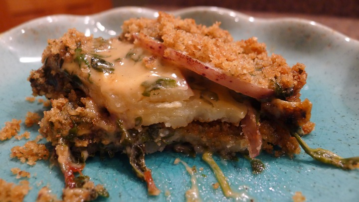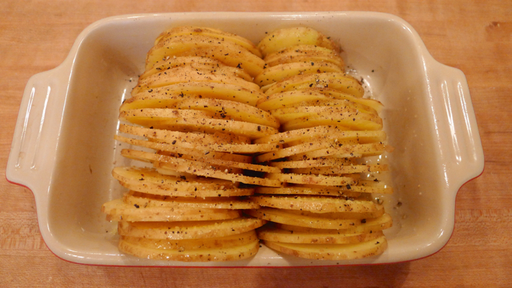If you’re making the potatoes, start with those as they need a while to bake. Preheat the oven to 350 degrees. Thinly slice the potatoes and layer them vertically in a baking dish. You may need to play around with how best to fit them in the dish depending on size. Add the garlic in between most of the potato slices, then mix some salt and pepper into a little bowl of olive oil, and brush well onto the potatoes. Bake in the oven for 1.5 hours, or until crispy and browned. If needed brush with a little more olive oil toward the end.