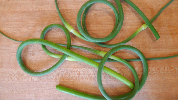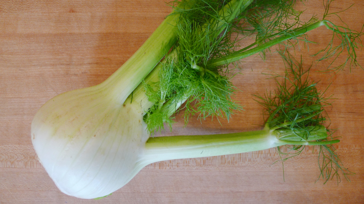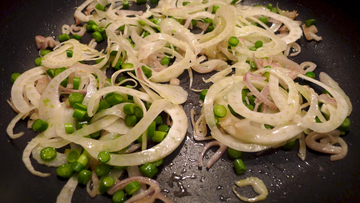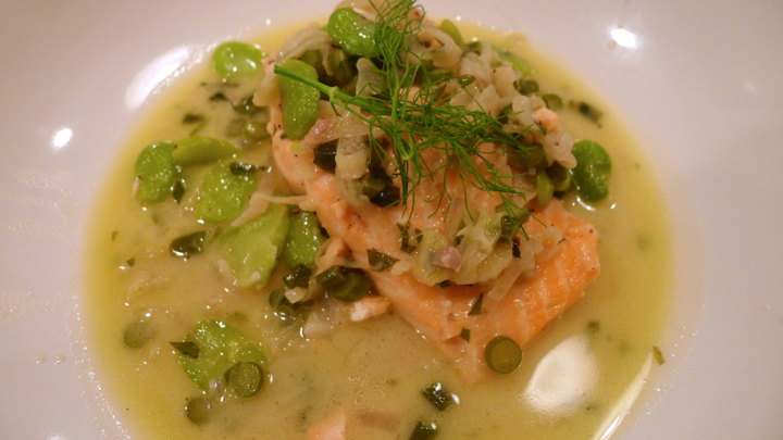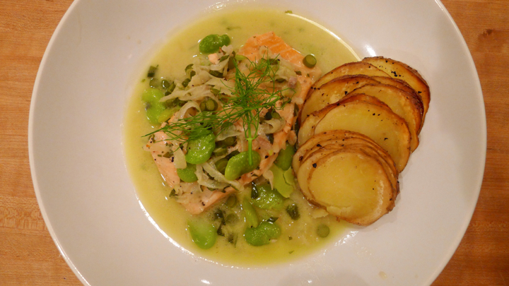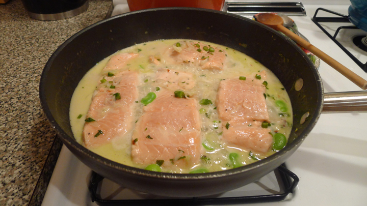 Now for the salmon. In a large skillet, saute the fennel, garlic scapes, and shallot in some olive oil until softened. Add the chicken stock and tarragon and let simmer for a few minutes. Next, add the crème fraîche, salt, and pepper. Cook for another minute or so, then nestle the salmon and fava beans into the pan, cover, and simmer for 15 minutes or until the fish is cooked through. Every couple of minutes spoon some of the sauce over the fish. Serve right away with potatoes on the side.